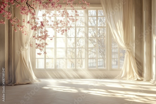 room, light, curtain, blossom, tree branch, window, nature, interior, decor, peaceful, sunlight, shadow, calmness, hardwood, spring, elegant, home, architecture, design, flora, softness, style, blooming, space, atmosphere, white, beauty, fresh, pastel, bright, cosy, aesthetic, flower, environment, warmth, scene, airy, blossom, view, season, freshness, natural, wood, serene, calm