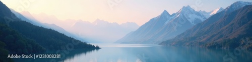Serene scene of a mountain river with softly colored peaks, calm atmosphere, peaks, landscape