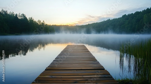Serene scene of a wooden dock extending into a calm lake with mist rising from the water at sunrise