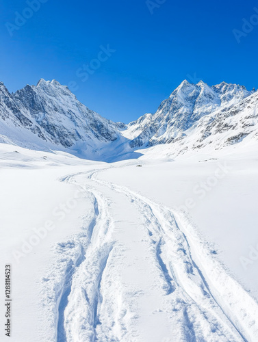Serene ski tracks wind through a pristine snow-covered valley, nestled between majestic snow-capped mountains under a vibrant blue sky.
