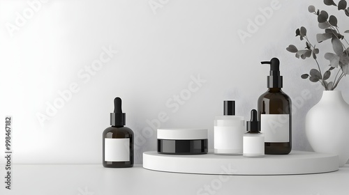Serene Skincare Routine Workspace with Luxurious Cosmetic Arrangement on Crisp White Background