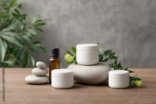 Serene skincare setup with natural elements, featuring cream jars, essential oil, stones, and greenery for a spa-like experience.