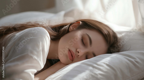 Serene Sleep, Relaxed Woman in Soft White Bedding, Side Portrait, Cozy Bedroom, Smooth Skin, Dreamy Mood, Restful Posture, Natural Lighting, Clean Aesthetic, Comfortable and Peaceful Atmosphere