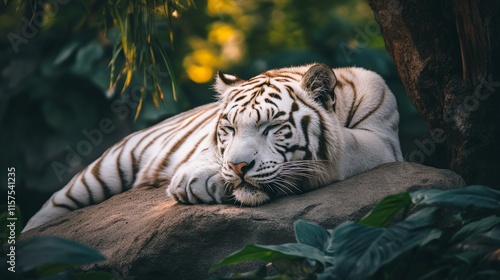 tiger, white, wildlife, animal, sleep, resting, peace, serene, calm, nature, jungle, forest, predator, mammal, wild, beautiful, stripes, eye, relaxed, paw, rock, leaf, green, dark, shadow, habitat, photo, portrait, closeup, wildcat, felino, fauna, mammalian, apex, carnivore, beast