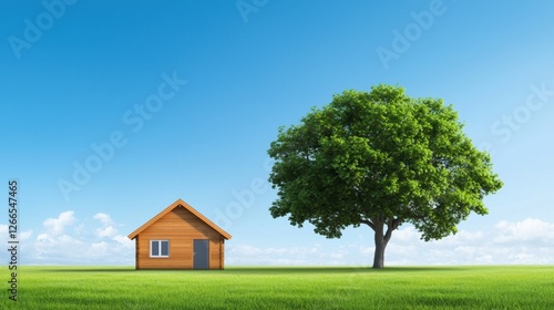 Serene Solitary Wooden Cabin Under Clear Blue Sky Beside Large Tree in Lush Green Landscape