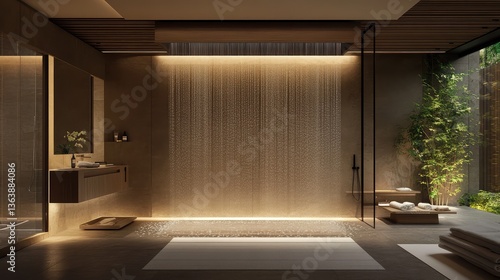 Serene spa hotel bathroom with a large rainfall shower, calming color scheme, and soft lighting. A tranquil space designed to help guests relax and recharge. Copy space available.