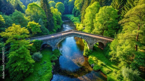 Serene Stone Arch Bridge Spanning a Tranquil River, Nestled Amidst Lush Green Foliage