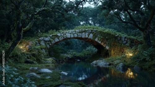 Serene stone bridge arching over tranquil stream amidst lush greenery in a mystical forest setting at twilight