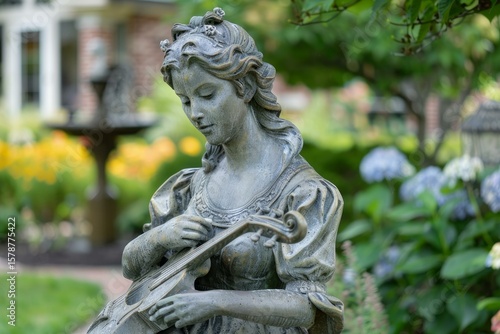 Serene stone statue of a young woman playing a stringed instrument, adding a touch of elegance to a vibrant garden setting with a fountain and colorful flowers
