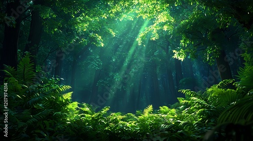 Serene Sunlight Streaming Through Lush Green Forest Foliage