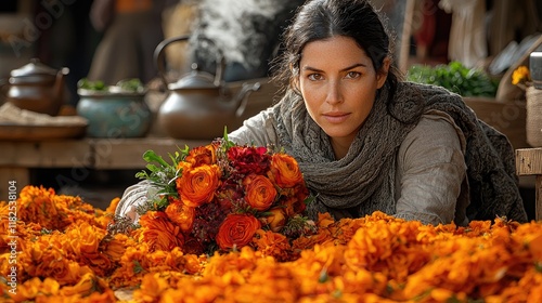 "Serene Sunlit Kitchen: Housewife Arranges Vibrant Flowers in Cozy Rustic Setting"