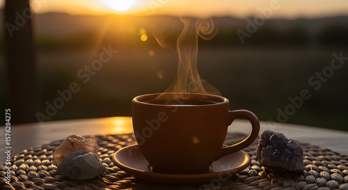 Serene Sunrise Coffee Moment: Warm Drink with Crystals at Dawn