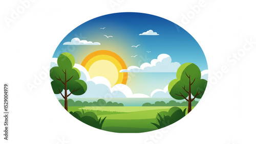 vector, illustration, scalable, graphic, logotype, icon, branding, nature, landscape, sunrise, sun, tree, green, field, sky, cloud, bird, design, element, symbol, emblem, badge, artwork, clip art, asset, resource, template, background, scenery, environment, ecology, peaceful, tranquil, serene, summer, spring, pastoral, idylli, vista, horizon