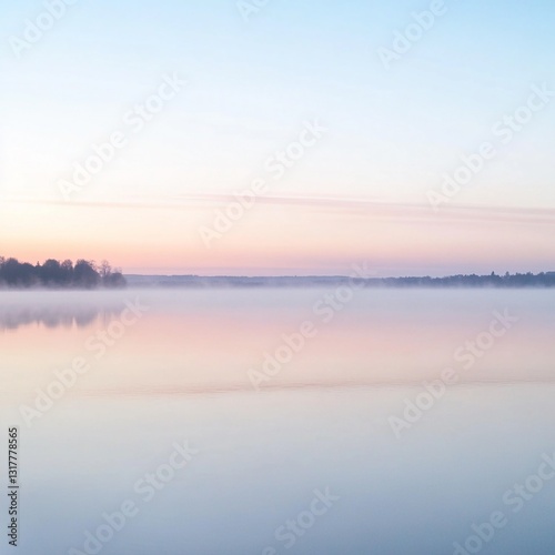 Serene Sunrise Landscape: Soft Mist Over Calm Lake with Pastel Reflections, Perfect for Relaxing Music Album Cover - Minimalist Tranquil Composition in Dreamy Atmosphere