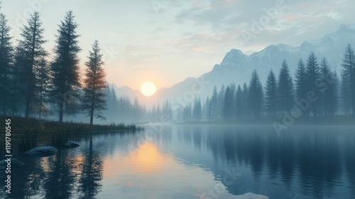 Serene Sunrise Over Misty Mountain Lake with Coniferous Trees