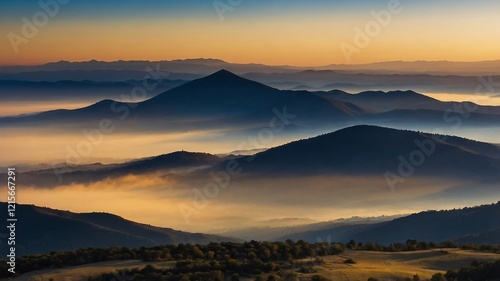 Serene Sunrise Over Misty Mountains and Dramatic Clouds in Scenic Outdoor Landscape