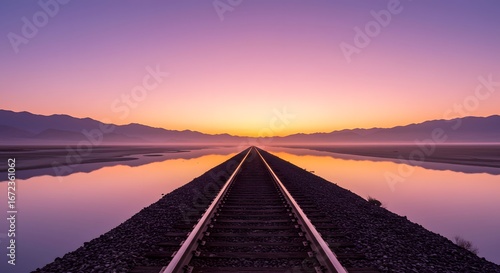 railroad, track, railway, train, line, rail, transport, travel, journey, path, way, route, direction, horizon, landscape, scenery, nature, view, vista, outdoors, environment, sunset, sunrise, dawn, twilight, sky, cloud, light, colours, water, lake, river, mountain, hill, range, peak, calm, serene, peaceful, tranquil, still, quiet