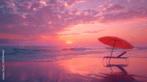 Serene sunset on a beach with pink hues. Calm sea waves with an umbrella and lounging chair. Peaceful and relaxing evening by the ocean.
