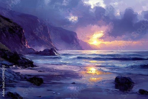 sunset, ocean, beach, coastline, cliff, wave, sea, sky, cloud, dramatic, serene, peaceful, tranquil, calm, golden hour, purple, twilight, landscape, nature, scenery, picturesque, beautiful, majestic, vibrant, colourful, artwork, painting, art, seabird, rock, shore, sand, water
