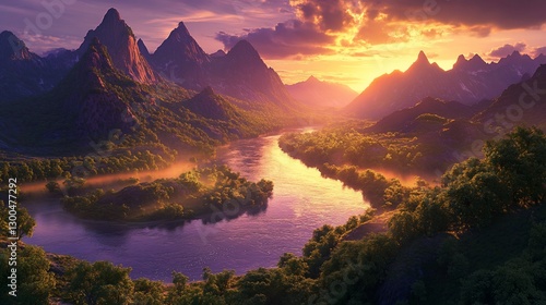 sunset, mountain, river, vale, landscape, nature, scenery, scenic, view, panorama, beautiful, majestic, serene, peaceful, tranquil, calm, quiet, idylli, breathtaking, stunning, amazing, gorgeous, spectacular, vibrant, colourful, gold, orange, purple, cloud, sky, sun, light, ray, tree, forest, water, horizon, dawn, dusk, wilderness, travel, adventure, exploration, journey, destination, escape, relaxation