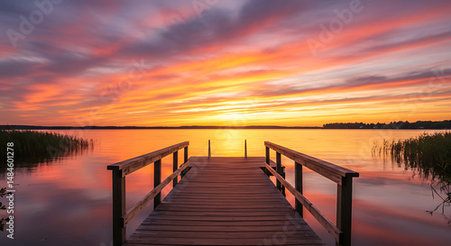 sunset, lake, dock, wooden, water, sky, calm, serene, peaceful, tranquil, orange, red, pink, cloud, evening, twilight, summer, nature, landscape, picturesque, beautiful, majestic, gold, fiery
