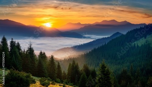 Serene Sunset Over Majestic Mountains Surrounded By Dense Pine Forests And Soft Mist In A Tranquil Landscape
