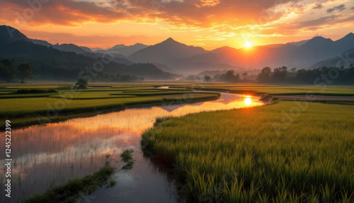 sunset, sunrise, mountain, landscape, nature, scenery, rice, paddy, field, water, river, stream, gold, orange, yellow, sky, cloud, tranquil, peaceful, serene, calm, beautiful, breathtaking, majestic, awesome, stunning, picturesque, idylli, rural, agricultural, greenery, vegetation, plant, vibrant, colours, light, shadow, evening, dawn, dusk, horizon, huge, expansive
