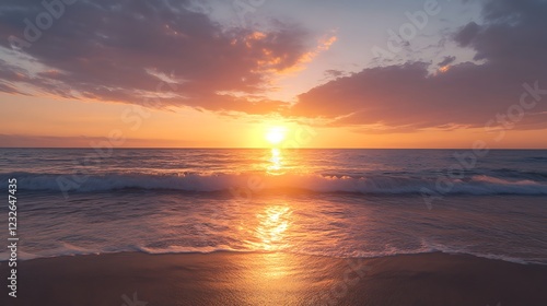Serene sunset over the ocean with waves gently lapping at the shore.