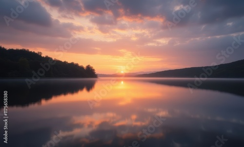 sunset, lake, serene, tranquil, nature, landscape, cloud, water, scenery, peaceful, horizon, calm, outdoors, evening, colours, vibrant, beautiful, sky, mountain, glow, dusk, photo, environment, scenic, wilderness, idylli, mood, serenity, dreamy, stunning, view, panorama, beauty, harmony, landform, peace, brilliancy, calmness, silhouette, light, golden hour, evening light