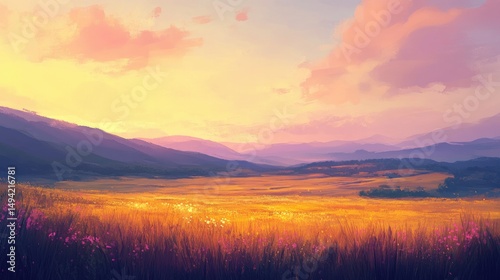 Serene Sunset Over Vast Fields with Gentle Hills and Colorful Sky Reflected in the Golden Landscape of Tranquil Rural Nature