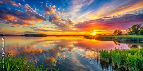 Serene Sunset Reflecting on a Calm Lake, with a Vibrant Sky Displaying Vivid Hues of Orange, Yellow, and Purple, Creating a Breathtaking Panorama of Nature's Beauty