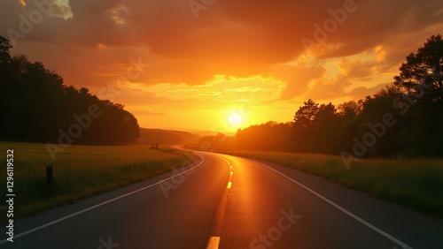 sunset, road, country road, travel, adventure, scenic, nature, landscape, golden hour, warm colors, asphalt, highway, summer, rural, tranquil, peaceful, escape, journey, tour tourism, inspirational, vibrant, high-coloured, golden light, tree, forest, meadow, grass, field, horizon, photo, photo, hi-res, hd, full frame, colours, orange, yellow, red, summer, calm, serene, beauty, freedom