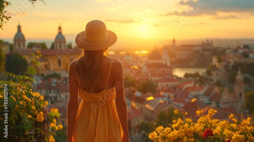 sunset, city landscape, woman, skyline, travel, tour tourism, golden hour, serenity, view, hat, ancient city, summer dress, backview, contemplation, relaxation, evening light, city view, scenic, overlook, wanderlust, sightseeing, tranquil scene, nature, urban, vacation, outdoors