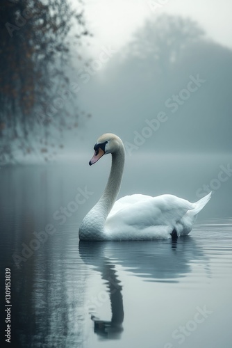 cygnet, lake, water, misty, foggy, serene, calm, peaceful, tranquil, quiet, elegance, grace, beauty, bird, feather, white, grey, blue, nature, wildlife, animal, aquatic, stillness, solitude, autumn, tree, landscape, moody