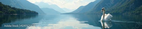 Serene swan glides on calm lake, majestic mountains backdrop, wildlife photography, mountains, lake