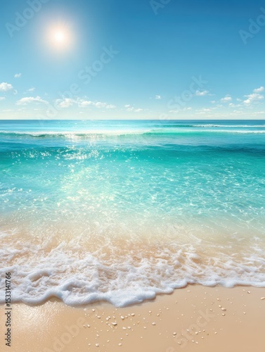 Serene tropical beach scene with clear turquoise water gentle waves soft sandy shore bright sunny sky and distant horizon