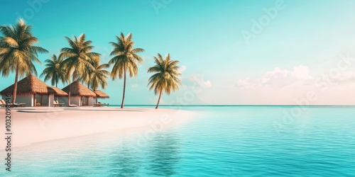 Serene tropical beach view with clear turquoise water, palm trees, and charming thatched-roof huts under a bright blue sky.