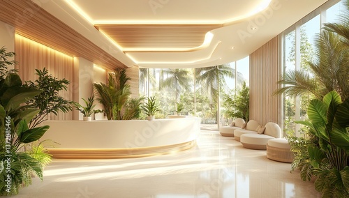 Serene Tropical Lobby Design: Modern Reception Area with Lush Plants and Natural Light