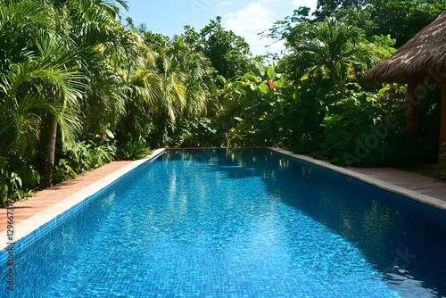 pool, water, blue, tile, relaxation, tropical, resort, vacation, greenery, garden, nature, sunshine, summer, peaceful, leisure, landscape, oasis, sunlight, exotic, scenery, tranquil, vacation spot, avocation, beauty, environment, sky, foliage, serenity, idylli, blue skies, craftsmanship, architecture, landscape design, luxury, calm, swimming, get-away, retreat, inviting, refreshment, recreation, bright, morning, day
