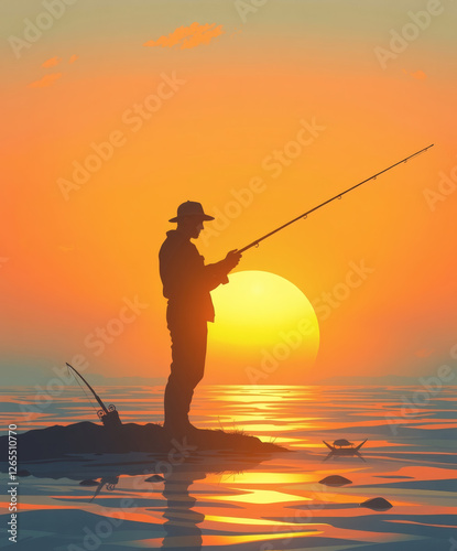 Serene twilight fishing as the sun sets over tranquil waters creating a captivating silhouette of a solitary angler