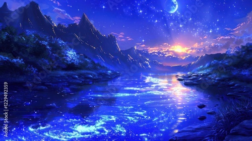 Serene twilight landscape with mountains and a shimmering river under a starry sky