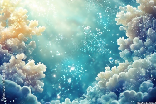 underwater, coral, bubble, ocean, sea, water, light, glow, serene, calm, peaceful, tranquil, blue, turquoise, teal, green, white, gold, yellow, sparkle, shimmer, glistering, magical, fantasy, dreamy, aethereal, abstract, background, texture, illustration, art, design, image, visual, vibrant, bright, soft, delicate, beautiful, stunning