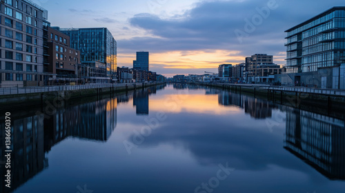 Serene Urban Landscape at Sunset Over Reflective River with Modern Architecture in View