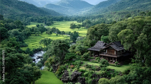Serene Valley View with Lush Rice Fields and Wooden House