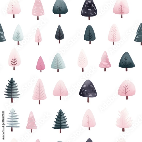 Serene Watercolor Fir Trees Covered in Snow in Minimalist Kawaii Style with Pastel Colors, seamless pattern, Generative Ai