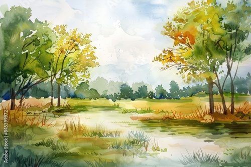 Serene Watercolor Landscape Painting of a Tranquil Meadow with Trees