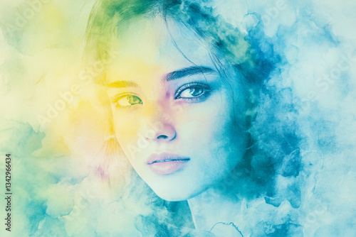 watercolor, portrait, woman, girl, young, face, blue, yellow, green, artistic, serene, calm, peaceful, dreamy, soft, beautiful, elegant, painting, image, illustration, abstract, background, fashion, subtile, design, texture, model, style