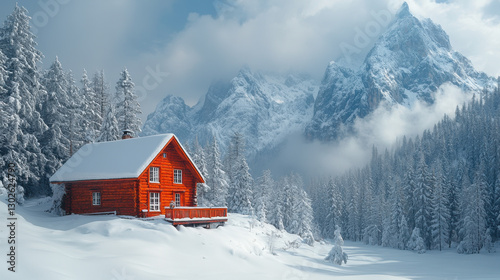 cabin, winter, snow, mountain, forest, serene, landscape, nature, red, wooden, tranquil, cold, scenic, rural, peaceful, cloudy, pine, wilderness, retreat, holiday, cosy, architecture, rustic, environment, travel, adventure, view, snow-covered, wonderland, remote, idylli, photo, natural, beauty, seasonal, picturesque, fresh, air, scenery