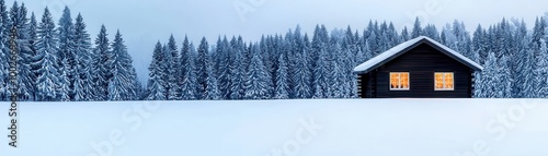 Serene winter landscape featuring a cozy cabin surrounded by snow-covered trees, illuminated windows casting a warm glow at dusk.