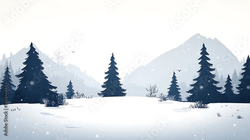 Serene Winter Landscape Illustration: Gently Falling Snow on Minimalist Mountain Scene. AI Generated